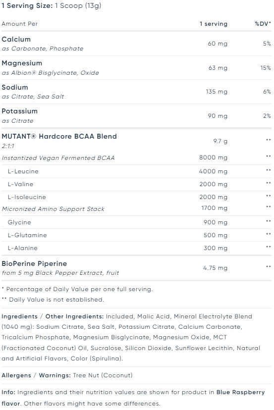Mutant Hardcore BCAA — мощный комплекс аминокислот с разветвлёнными цепями в классическом соотношении 2:1:1 (лейцин, изолейцин, валин). Продукт предназначен для защиты мышц от разрушения во время интенсивных тренировок, ускорения восстановления и стимуляции синтеза белка.