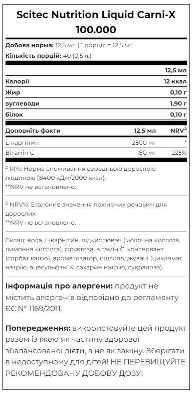 L-карнитин играет ключевую роль в транспортировке жирных кислот в митохондрии, где они расщепляются для производства энергии. Scitec Carni-X 100 000 Liquid помогает уменьшить жировые отложения, улучшить восстановление и повысить эффективность тренировок. Витамин B5 (пантотеновая кислота) поддерживает нормальный энергетический обмен и работу нервной системы, усиливая действие карнитина.