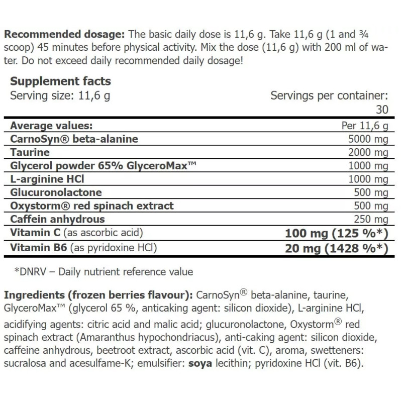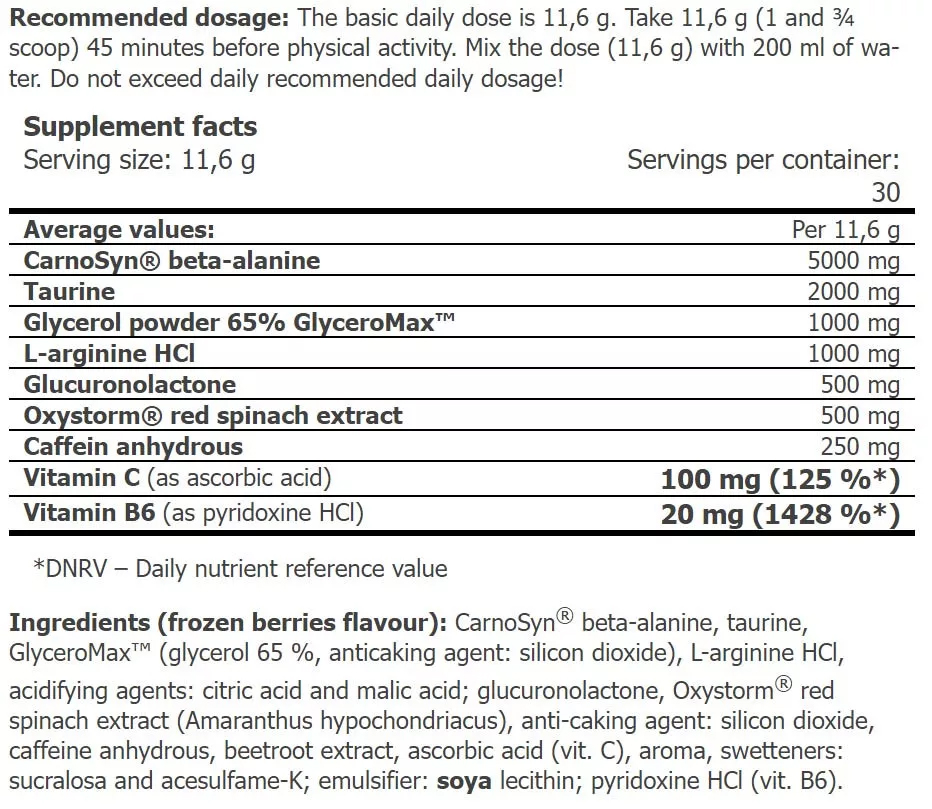 Рекомендация по приёму: размешать 1 мерную ложку (11,6 г) в 200 мл воды, принимать за 30–45 минут до тренировки. Не рекомендуется употреблять перед сном.