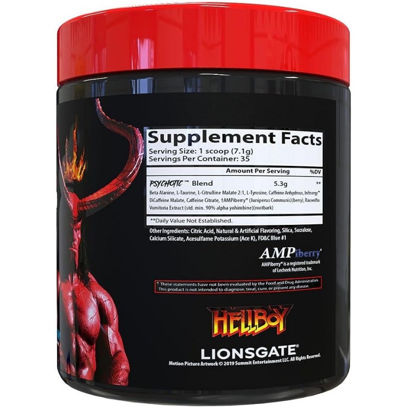 Psychotic: Hellboy Insane Labz — это предтренировочная формула, ориентированная на интенсивные тренировки, где важны энергия, концентрация и стабильная работоспособность. Состав построен на сочетании стимуляторов, аминокислот и нейроактивных компонентов, которые активируют центральную нервную систему и повышают физическую отдачу. Кофеин в комбинации с дополнительными стимулирующими веществами обеспечивает выраженный энергетический импульс без резкого спада. Аминокислоты и осмолитические соединения поддерживают мышечную выносливость, внутриклеточную гидратацию и качество пампа, что особенно важно при силовых и функциональных нагрузках.
