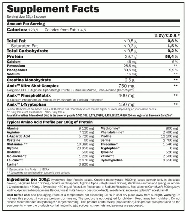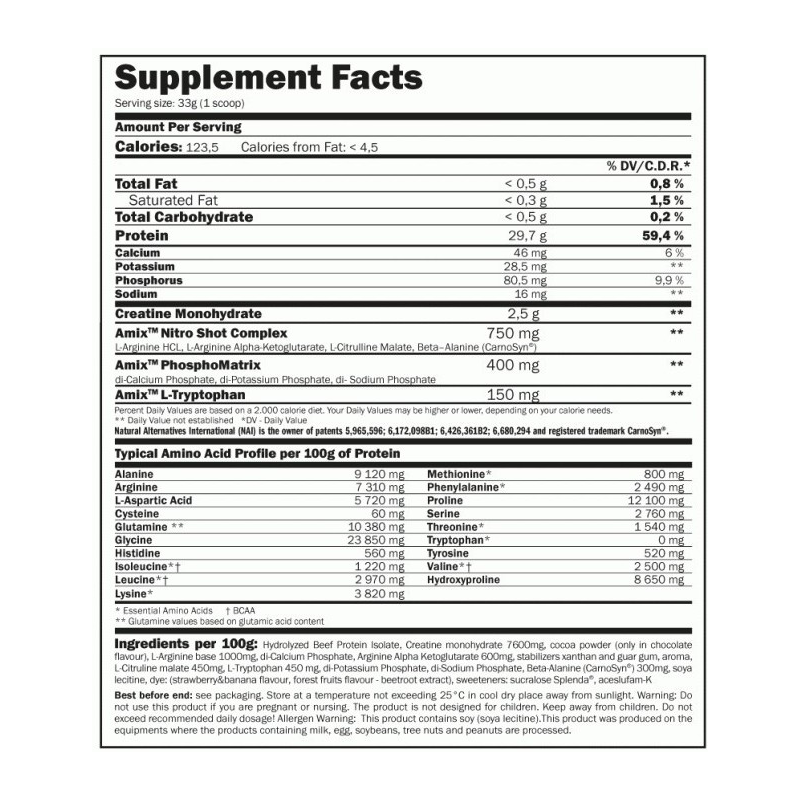 Основу формулы составляет гидролизованный говяжий белок с высокой биодоступностью. Такая форма протеина быстро усваивается и обеспечивает мышцы полноценным аминокислотным профилем, включая BCAA и глютамин. Белок животного происхождения поддерживает синтез мышечных волокон, силовые показатели и восстановление после интенсивных нагрузок.