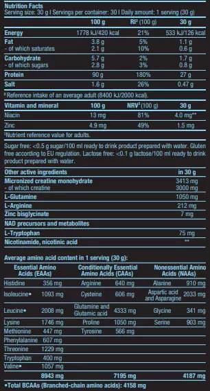 Рекомендация по приёму: смешайте 1 мерную ложку (30 г) с 250 мл воды или обезжиренного молока. Принимайте 1–2 раза в день — сразу после тренировки и/или между приёмами пищи.