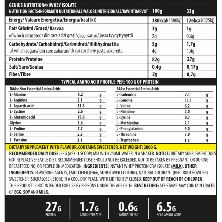 Genius Nutrition iWhey Isolate — это высококачественный изолят сывороточного белка с максимальной биодоступностью и минимальным содержанием углеводов и жиров. Продукт создан для профессиональных спортсменов и всех, кто стремится к чистому набору мышечной массы без избыточных калорий.