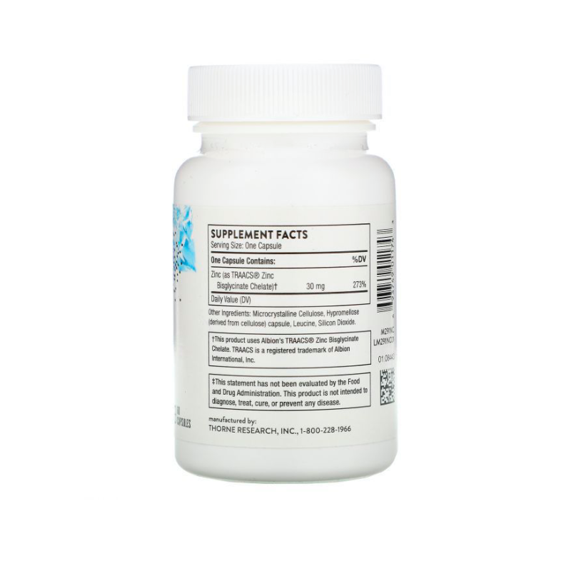 Thorne Research Zinc Bisglycinate 30 мг - це чудовий вибір для тих, хто хоче підтримати імунну систему, поліпшити стан шкіри та волосся, а також заповнити дефіцит цинку в організмі.
