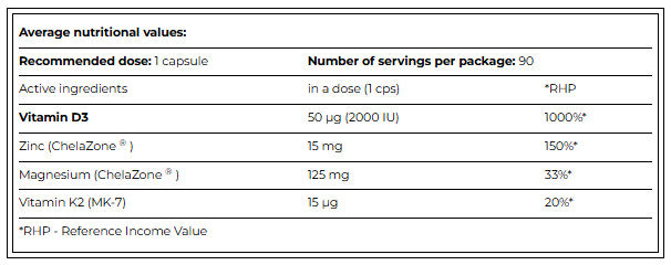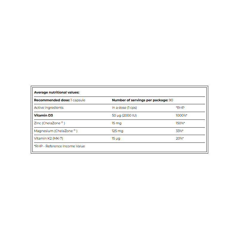 Витамин D3 (холекальциферол) способствует укреплению иммунитета, улучшает работу мышц и поддерживает уровень тестостерона у мужчин. Витамин K2 (в форме менахинона-7) активирует белки, которые регулируют распределение кальция. Магний поддерживает нервную систему, участвует в энергетическом обмене и расслаблении мышц, а цинк необходим для синтеза гормонов и восстановления клеток.