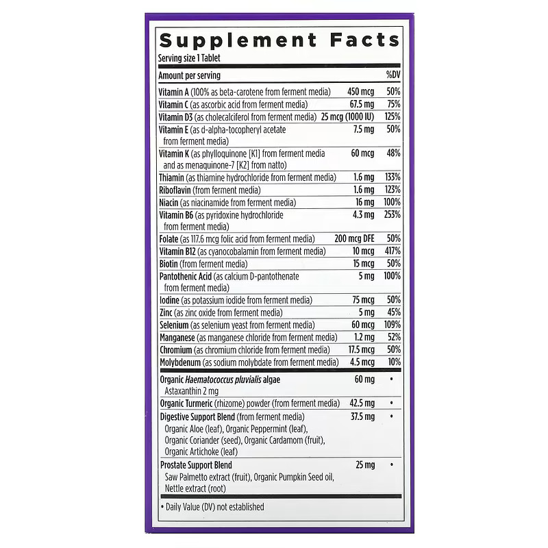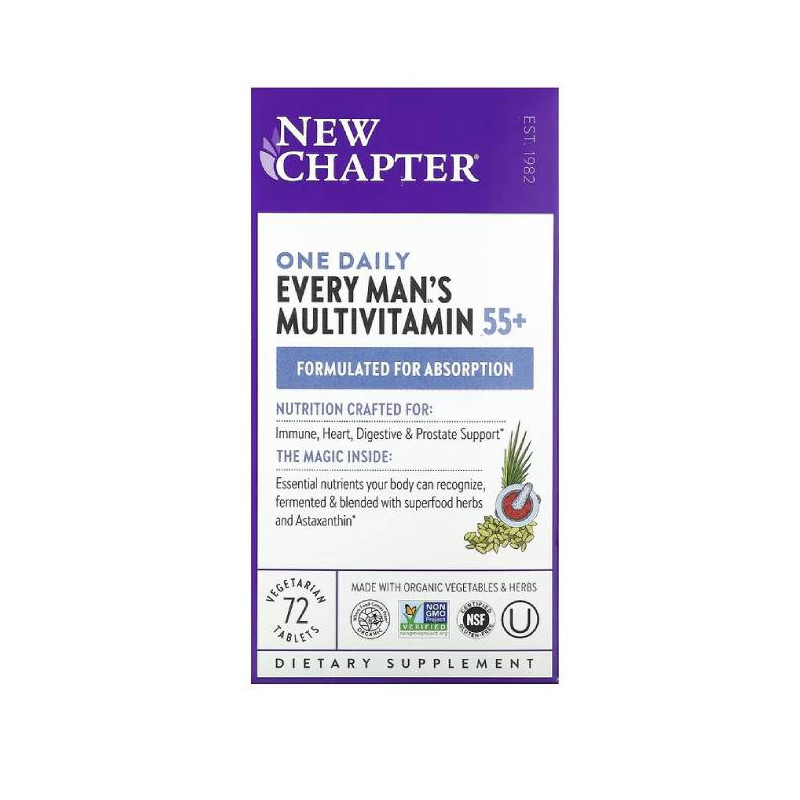 New Chapter One Daily Every Man's Multivitamin 55+ — это ежедневный мультивитаминный комплекс для мужчин старше 55 лет, созданный с учётом возрастных изменений обмена веществ, потребности в поддержке сердца, костей, иммунитета и когнитивных функций. Формула выстроена вокруг легкоусвояемых форм витаминов и минералов без избыточных доз, что делает продукт удобным для регулярного применения.