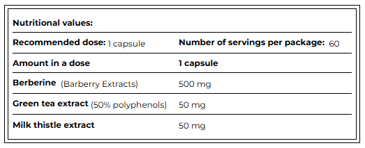 Сбалансированная композиция, основанная на берберине HCl, зелёном чае и одуванчике, делает этот продукт универсальным средством для тех, кто стремится поддерживать обмен веществ, контролировать сахар в крови, заботиться о здоровье печени и сосудов. При систематическом приёме возможно ощутить повышение жизненного тонуса, более стабильный обмен веществ и уменьшение перегрузки на внутренние системы.